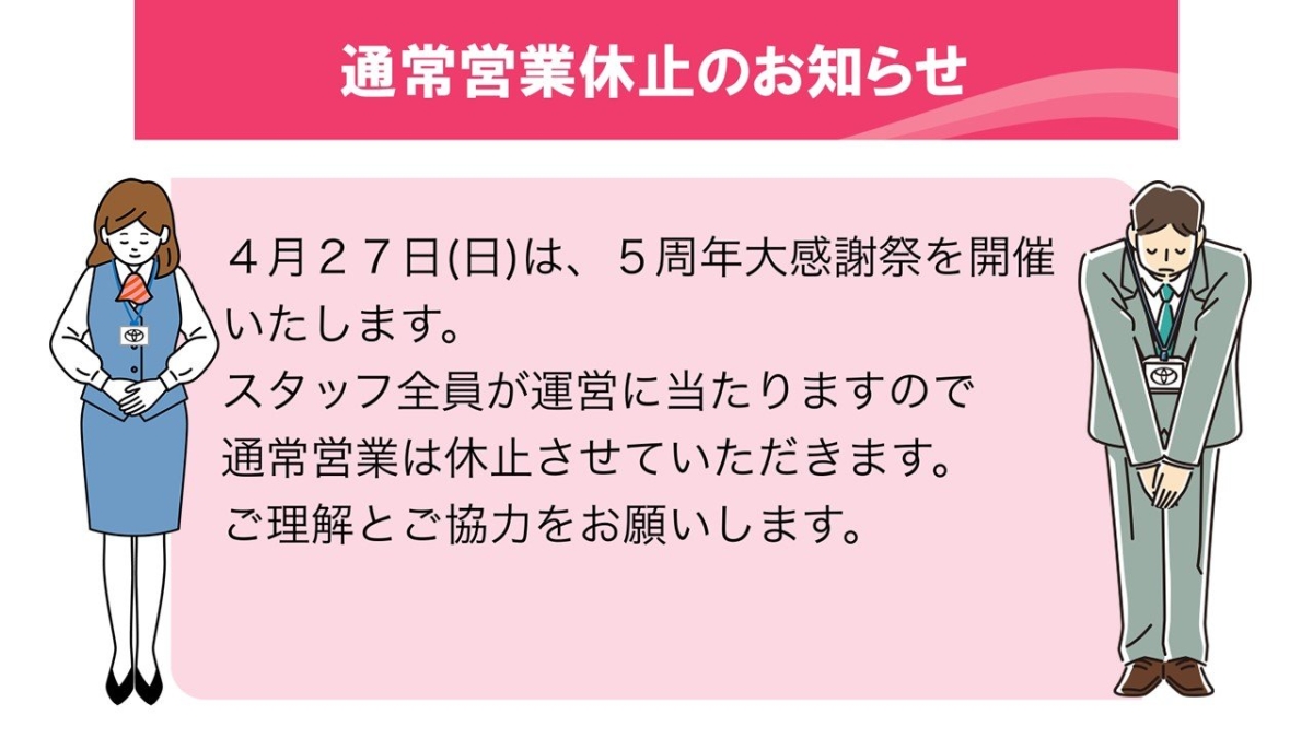 2025年04月18日 通常営業休止のおしらせ 通常営業休止のお知らせ 4月27日(日)は、5周年大感謝祭を開催いたします。 スタッフ全員で感謝祭の運営に当たりますので、通常営業は休止させていただきます。 ご不便をおかけしますが、ご理解とご協力をお願いします。 事故、故障でお困りの際は、JAFまたはご加入の任意保険ロードサービスをご利用ください。 JAF連絡先 ナビダイアル:0570-00-8139