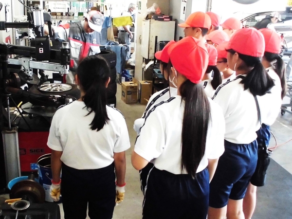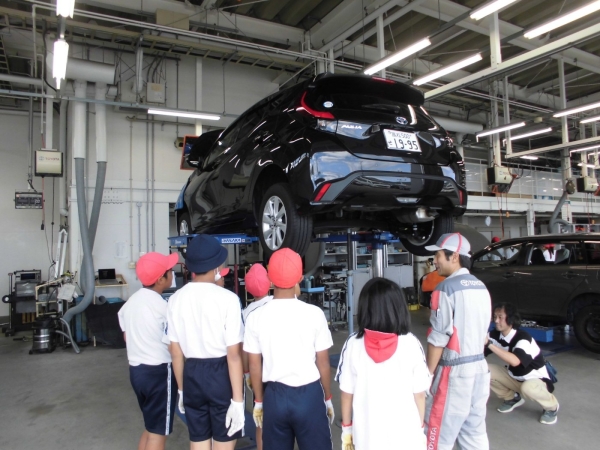 ・エンジン・ミッションなど部名称確認、タイヤ交換見学、空気圧調整、工具の使い方、車検(検査)の流れ、洗車機見学