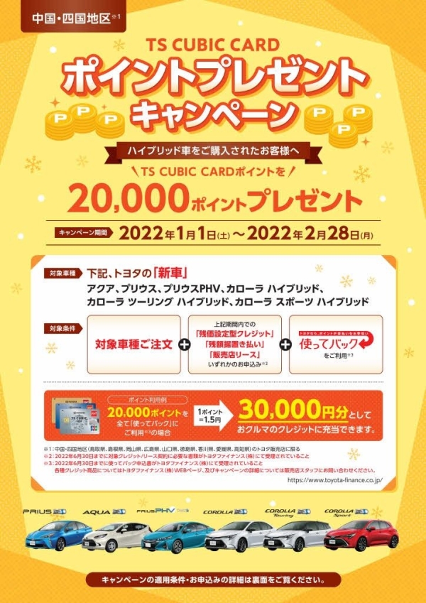 今年1月1日~2月28日の期間中、「中国・四国地区」の方のみ、新車のハイブリッド車のご購入で、なんと20,000ポイントプレゼント!!今カードをお持ちの方も、これからご入会の方も20,000円分のポイントがゲットできます!(※対象車種・対象条件はチラシをご覧下さい)