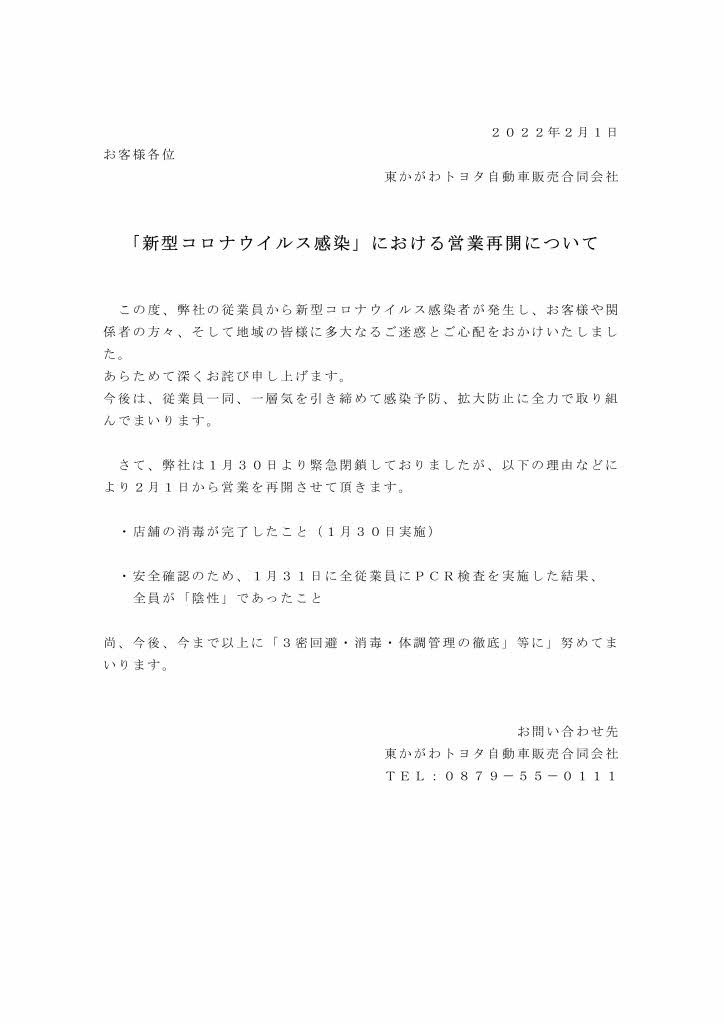 「新型コロナウイルス感染」における営業再開について